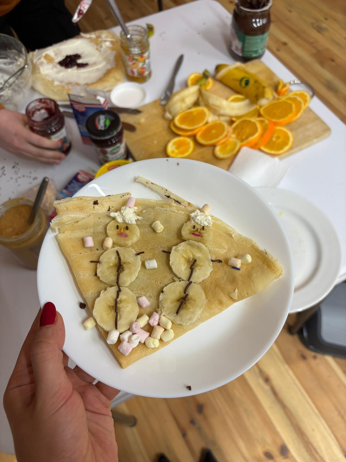 Another fun activity at the youth center was the Christmas-themed crepe-making competition 🎄 Everyone decorated their own crepes and took photos. I decorated mine as a snowman ☃️