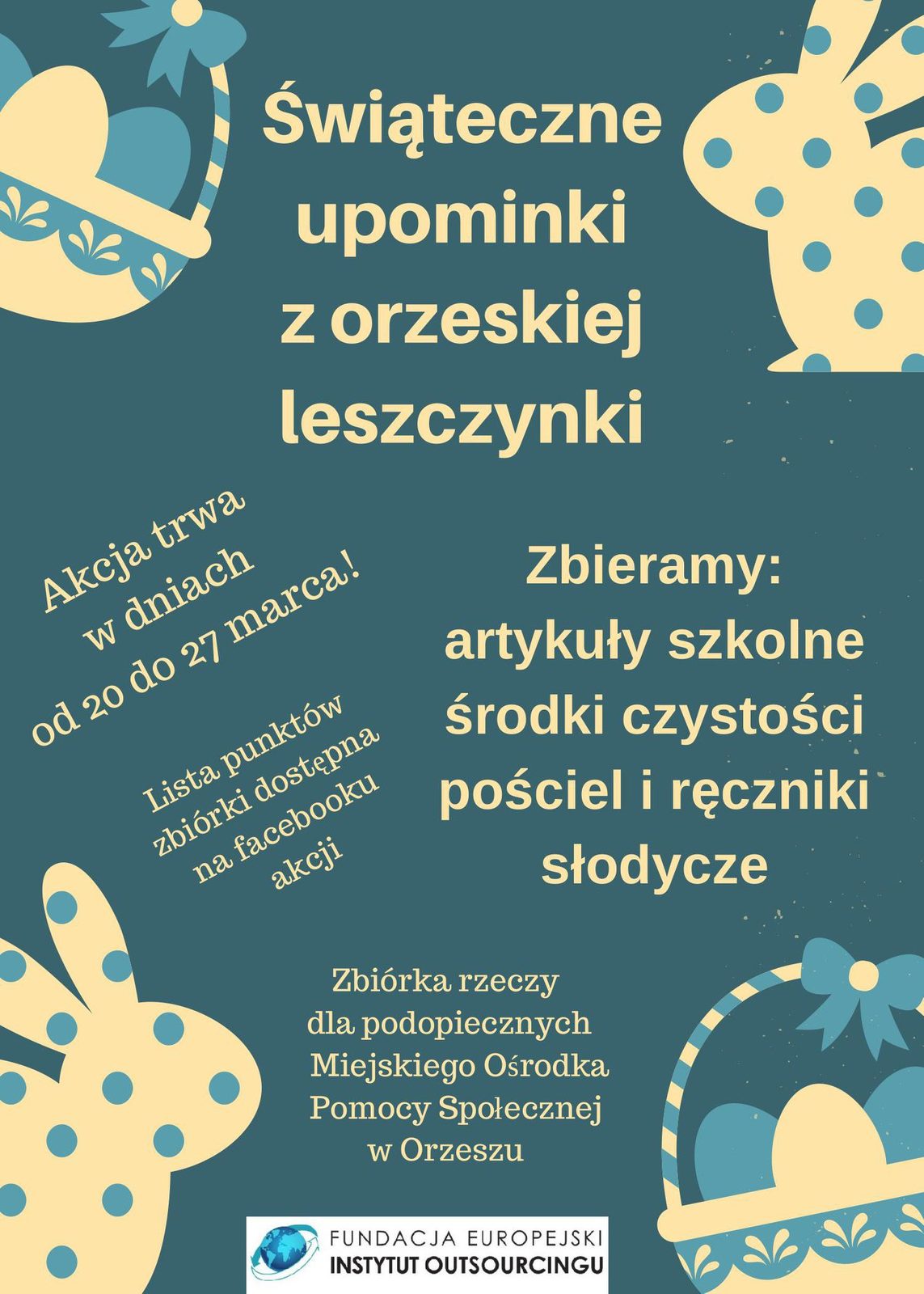 Podczas wielkanocnej edycji akcji pt. Świąteczne upominki z orzeskiej Leszczynki zbieramy słodycze, artykuły szkolne, środki czystości, ręczniki i pościel. Zbiórka odbędzie się w dniach od 20 do 27 marca. Rzeczy będzie można oddawać w różnych puntach na terenie Orzesza (szczegółową listę miejsc będzie można pobrać z facebooka akcji).