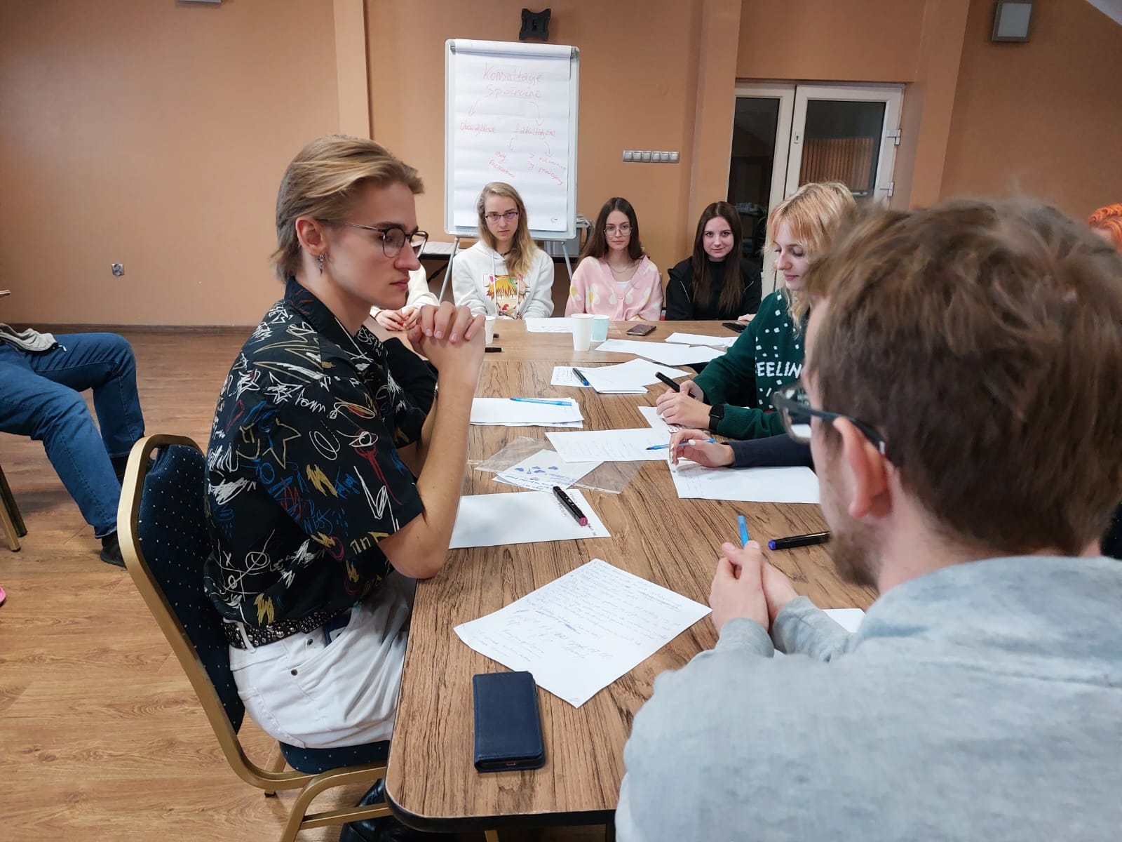 Drugiego dnia rozpoczęliśmy dzień od zajęć poświęconym lękom przed konsultacjami. Następnie staraliśmy znaleźć sposoby jak tym lękom podołać i przeszliśmy do podstaw konsultacji społecznych. Pod sam wieczór młodzież miała za zadanie przeprowadzić symulacje rozmowy z dziennikarzami, którzy mieliby wypromować ich konsultacje. Pod okiem eksperta Łukasza Pietrzyka nauczyli się wielu niuansów jak rozmawiać z mediami.